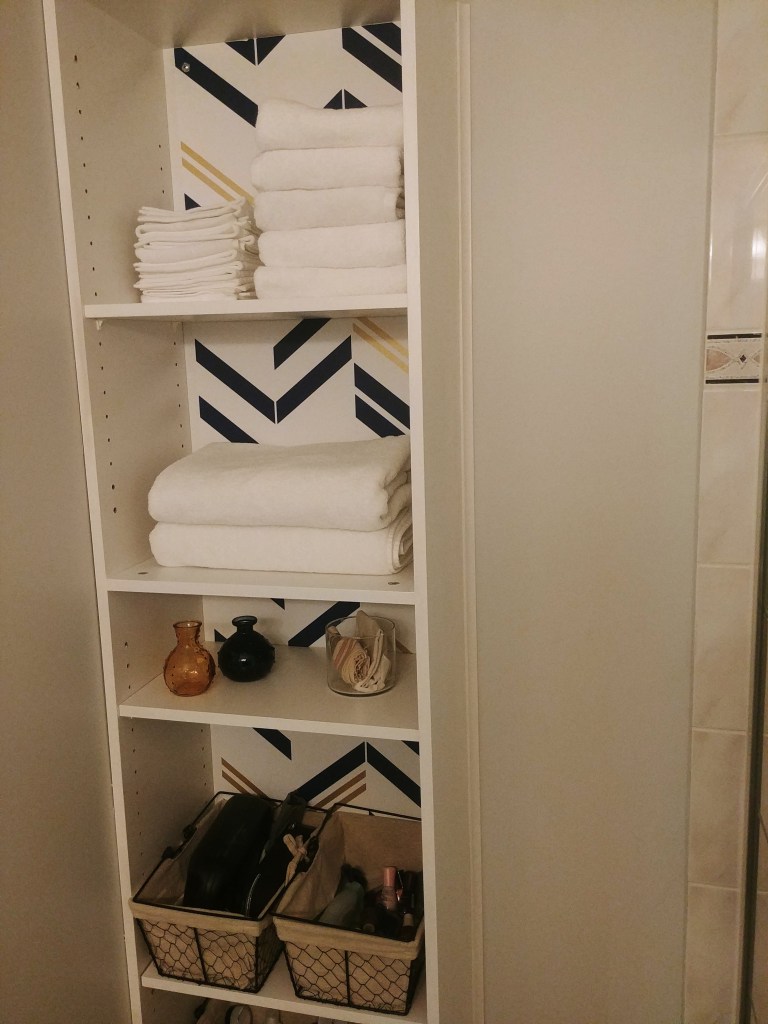 Next, in our ensuite bathroom, I sanded and painted part of this cabinet that had discoloured, and then took a small leftover piece of wallpaper from the laundry room and put it in here, giving it a nice textured effect. For more detail on the entire ensuite bathroom, check out Andrea’s blog post here.