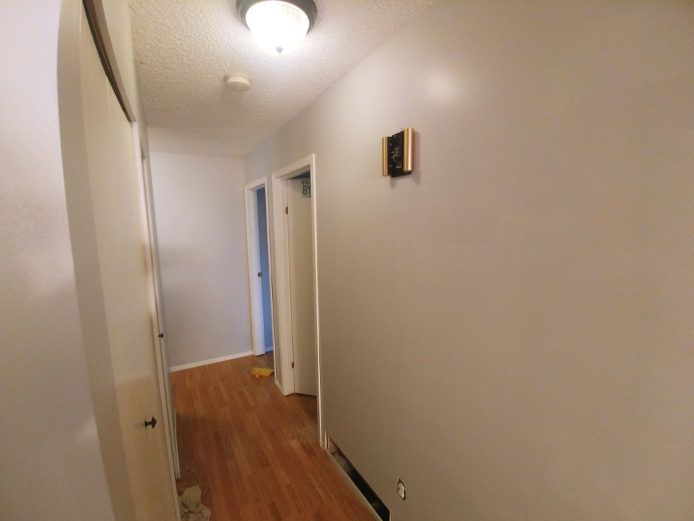 These next few photos don’t show everything, or even many finished sections, but they represent random moments over the past couple months when I stepped back to contemplate my work. There’s a before, two in progress and one finished. Mostly, everything has gone from brown to light grey/white. Sidenote: I’m not done yet! I’ve got a couple rooms and a ceiling left to go.