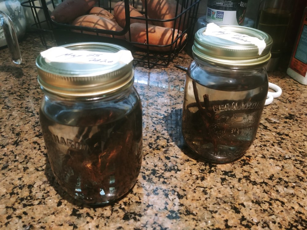 Also at the end of May, I embarked on a new adventure of making my own vanilla extract. All it takes is vanilla beans and vodka. I split and cut the beans, submerged them in vodka in a couple mason jars and popped them into the cupboard. To be truly amazing, they need to age for an entire year, but I will begin using them whenever I run out of the artificial extract, probably around the 4-6 month range. I’m very excited to always have real vanilla for the future.