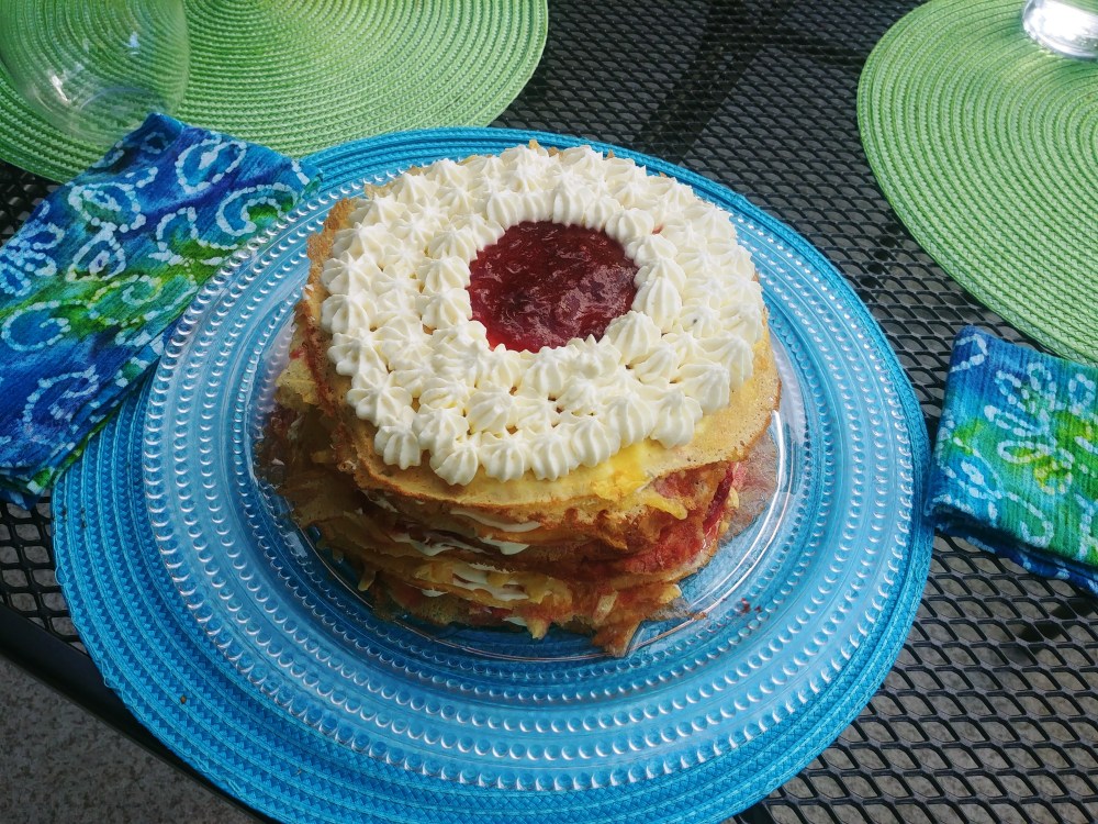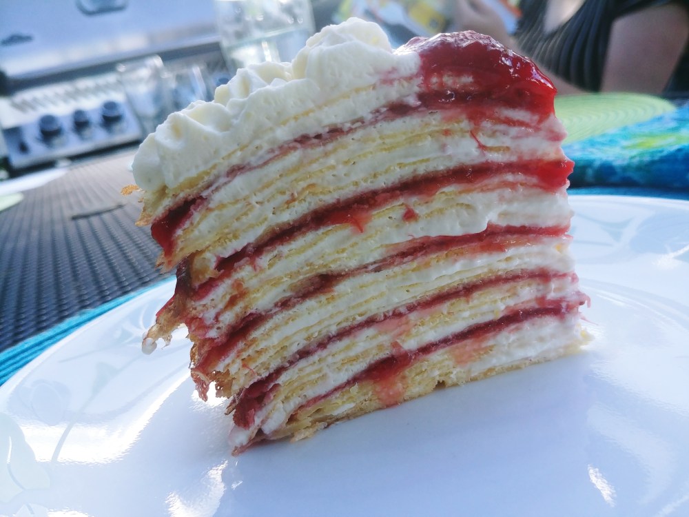 Soon up was Father’s Day, where we built a phenomenal charcuterie board and I made a crepe cake with lemon white chocolate mascarpone cream and Andrea’s homemade strawberry rhubarb jam for filling. It was delicious!!