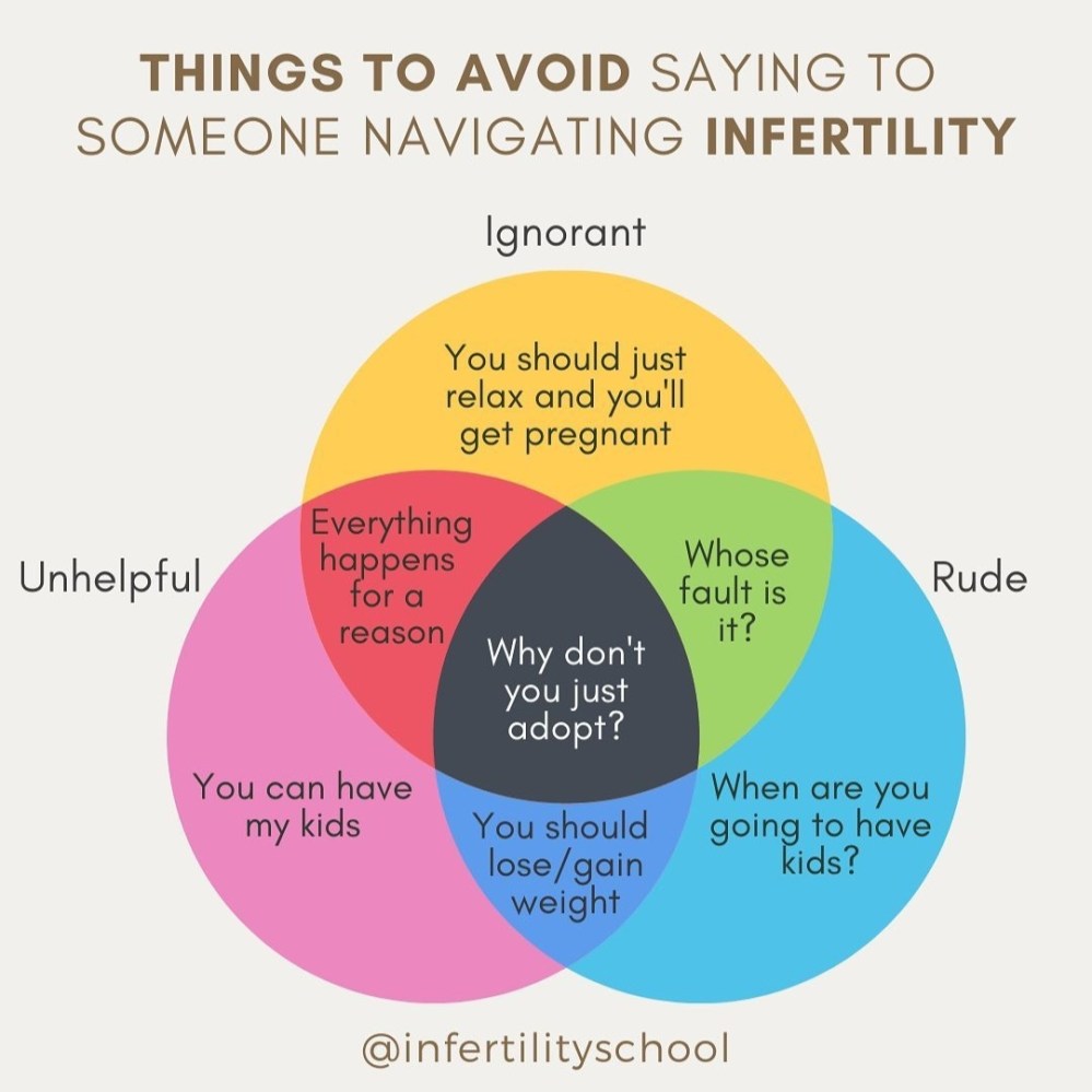 Every person who deals with infertility is going to have unique and different feelings to everything. Regardless of how certain things are intended, sometimes it impossible not to feel hurt, or just…tired. I recommend everyone take a look at this diagram of what not to say in these situations.